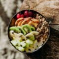 honey, granola, mixed seasonal fresh fruits, cocoa nibs